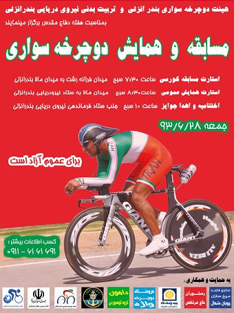 "مسابقات دوچرخه سواری قهرمانی استان گیلان به میزبانی هیئت دوچرخه سواری بندرانزلی و به مناسبت هفته دفاع مقدس در تاریخ 93/6/28 به مسافت ۴۵ کیلومتر از میدان فرزانه رشت به میدان مالا بندرانزلی برگزار شد. در این مسابقات ۵ تیم در قالب ۵۳ ورزشکار در دو گروه سنی زیر ۴۰ سال و بالای ۴۰ سال شرکت داشتند."
