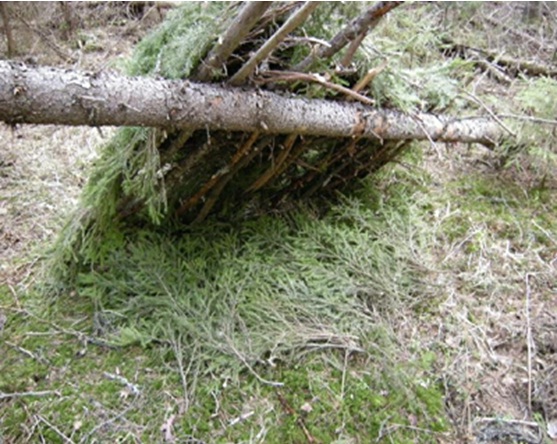 بررسی کنید محلی که برای خود تعبیه کرده اید به اندازه کافی برای شما جا داشته باشد. از یک طرف به آن طرف کلبه شاخه های کوچکتر و و علفهای هرز را قرار دهید. خار و خاشاکی مثل برگهای سوزنی کاج، گیاهان هرزه و برگها را در داخل شاخه های کوچکتر طوری قرار دهید که به اندازه یک اینچ ضخامت داشته باشد. در پایان برای اینکه این کلبه را در جای خود نگه دارید چند شاخه بالای آن قرار دهید