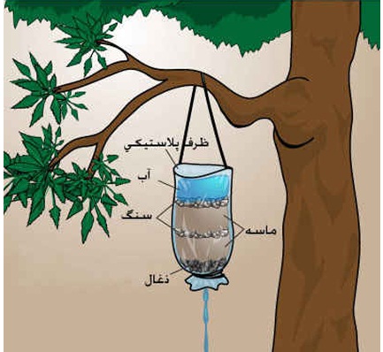 به منظور حذف ذرات معلق و بو نیز می توانید از یک سیستم تصفیه خانگی استفاده کنید. برای ساخت این فیلتر ظرف پلاستیکی مانند ظرف نوشابه خانواده یا کیسه پلاستیکی محکمی را انتخاب و بصورت متناوب دردرون آن لایه هایی از سنگ ریزه، شن و پارچه قرار دهید در قسمت مقطع پایینی چند سوراخ کوچک قرار دهید این مجموعه را در یک نقطه آویزان و آب را به قسمت بالایی اضافه نمایید تا به سمت سوراخها از لایه های مختلف عبورو تصفیه شود آب را در ظرف دیگری جمع آوری نمایید.می توانید این عمل را چند مرتبه تکرار کنید تا آب شفاف تر شود.از ذغال اجاقتان نیز به منظور حذف بو استفاده نمایید.البته این تنها موجب تصفیه فیزکی آب شده و ترجیحا جوشاندن آب را فراموش نمایید