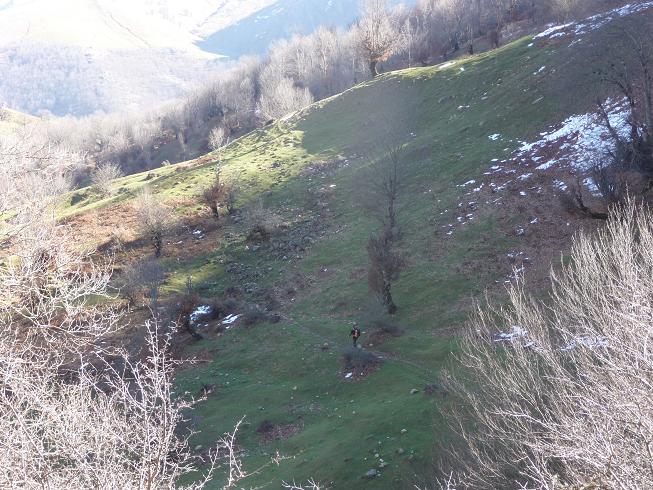 منظره پوشیده از برف کوه در روبروی دشت که انگار بر انتهای دشت به سجده افتاده و در برابر این زیبایی در حال شکر گزاریست و دامنه خاکی کوه در پشت سر ما و عظمت دشت ...همه و همه تو را فرا می گیرد. سکوت دشت گویا ترین کلام دشت است. می ایستم و به اطراف نظاره می کنم و کله قندی زیبا در دور دست و دیواره با شکوه کوه روبار در نزدیکتر قابل مشاهده اند. ارتفاعی که جی پی اس برای بیله گاه نشان می دهد حدود 1866 متر است. کمی جلوتر باریکه چشمه ای وجود دارد. بالاتر از چشمه منتظر گروه می مانم. آقای رسولی جلوتر رفته و پا کوب مناسب را پیدا می کند. باید از داخل جنگل عبور کنیم.