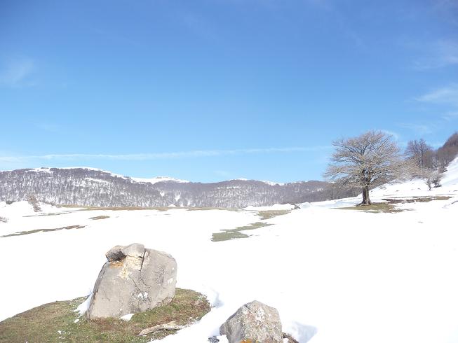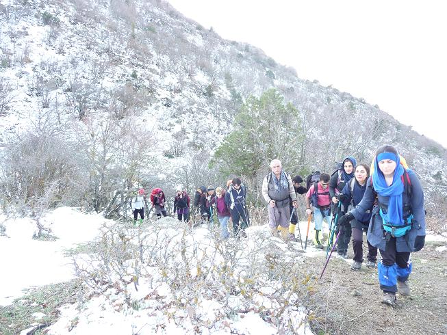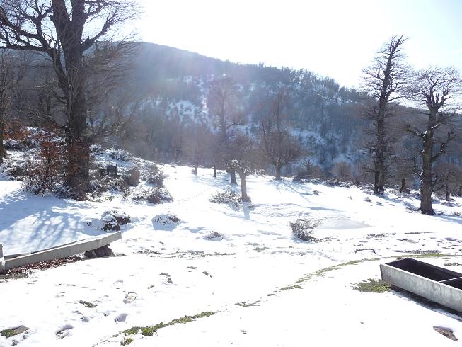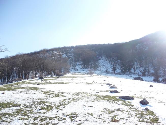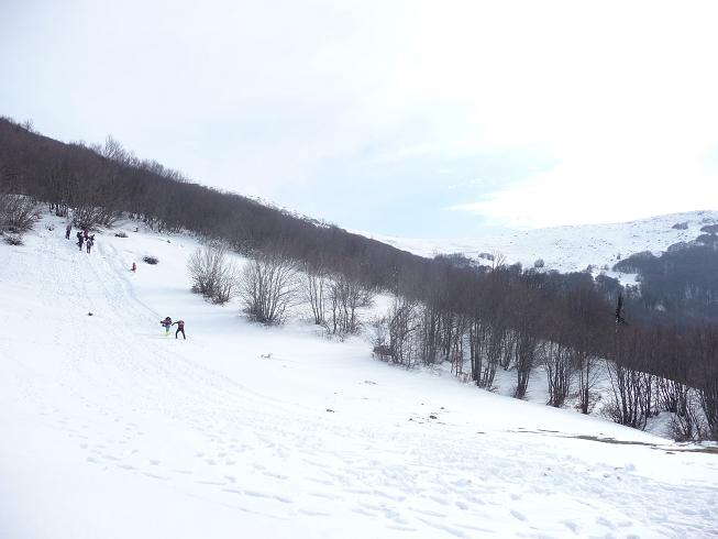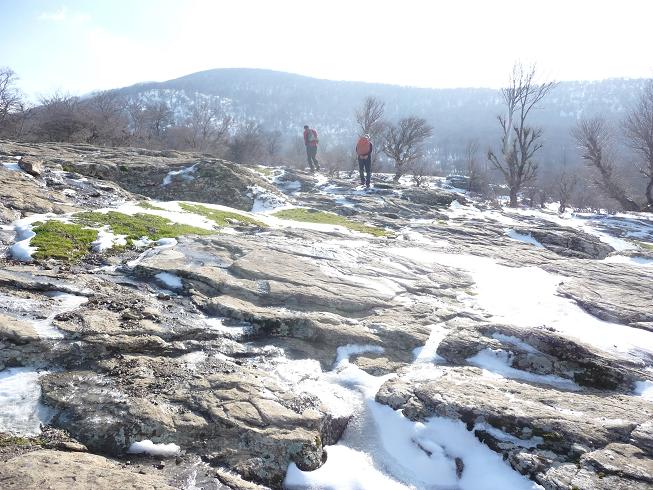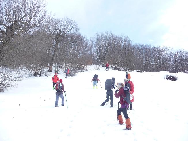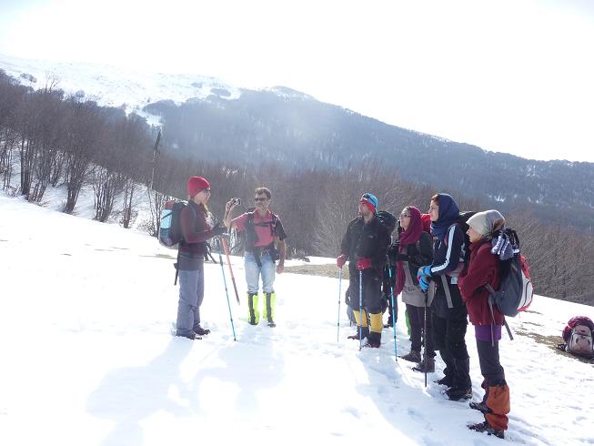 آبی نوشیده و به راه می افتیم. از این جا میزان برف بیشتر است و گروه تصمیم می گیرد با گامی تندتر و انجام برف کوبی به مسیر ادامه دهد. سه نفر از همنوردان با گامی آرامتر پشت گروه حرکت می کنند. پس از عبور از منطقه جنگلی و رسیدن به ییلاقی وسیع و پر برف در ساعت 12:45 با تصمیم سرپرست پایان صعود اعلام می شود ( ارتفاع حدود 1809 متر است. ) و تمرین گام برداری در برف و بالا رفتن و پایین آمدن روی شیب با راهنمایی همنوردان رشتی انجام می گیرد.