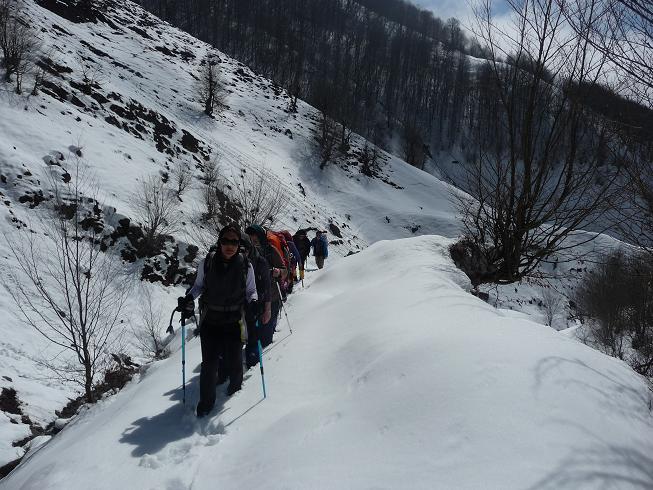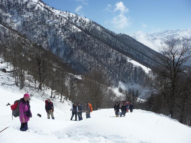 در ساعت 9:00 در ارتفاع 1230 متری برای استراحت و نوشیدن آب توقفی کوتاه کردیم و سپس به راه افتادیم. در بعضی قسمت ها برف بالاتر از 50 سانتی متر هم می رسید می توان گفت به طور متوسط نیم متری برف داشتیم.