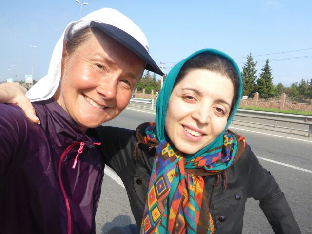 با مو های خیس خشک کرده نکرده ، لباس پوشیدم و با دوچرخه به سمت میدان مالا رفتم. همین که رسیدم آقای هاشمی و کریستینا پالتن ( دونده و ورزشکار سوئدی ) تازه رسیده بودند. آقای هاشمی برگشت تا با دوچرخه اش دوباره برگردد و من با کریستینا به سمت جاده رشت راهی شدم. کریستینا چهره بسیار مهربان و دوست داشتنی ای داشت. با انگلیسی دست و پا شکسته باهاش صحبت کردم. مهندس بود و خیلی از کشور های اروپایی رو به همین صورت سفر کرده بود. کالسکه سه چرخ کوچکی هم همراهش بود که وسایلش را با آن حمل می کرد. سه چرخه را به جلو می راند و پشت آن به حالت دو حرکت می کرد. در مسیر با هم عکسی گرفتیم که تازه برایم فرستاد. آنقدر تند راه افتاده بودم که دوربینم را فراموش کرده بودم.