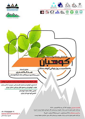 بمناسبت 11 دسامبر روز جهانی کوهستان, دوشنبه ۲۳ آذرماه سال جاری همایشی با مشارکت دفتر محیط زیست وزارت ورزش و جوانان، فدراسیون کوهنوردی و صعودهای ورزشی، هیئت کوهنوردی استان تهران، انجمن حفظ محیط کوهستان وانجمن کوهنوردان ایران در تالار سرو سازمان محیط زیست واقع در پارک پردیسان ساعت ۱۶/۳۰ برگزار خواهد شد ...