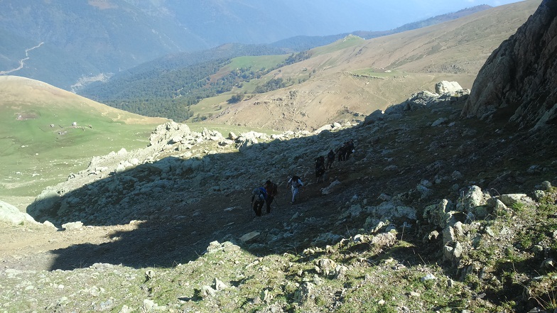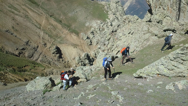 مسیر سنگی را از کنار دیواره و سنگ بزرگ در چپ خود بالا کشیدیم و ساعت 12:10 روی یال سنگ بزرگ در ارتفاع 2500 متر بودیم.