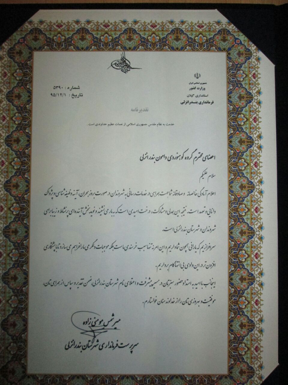 اهدا لوح سپاس و تقدیر فرماندار محترم بندر انزلی به گروه کوهنوردی دامون جهت اعلام آمادگی و همکاری در مدیریت بحران 95