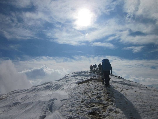 پر شیب ترین قسمت مسیر شیب انتهای آن یعنی بین کلبه ها و قله است. از نکات قابل توجه آب شدن برف هایی بود که در هفته های گذشته در منطقه باریده بود که این امر کمی از سختی مسیر کاسته بود. کمی باد می وزید که موجب کندی حرکت گروه بود.