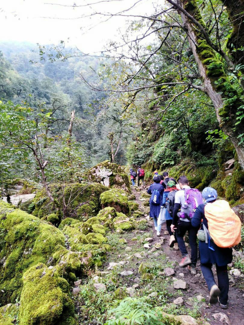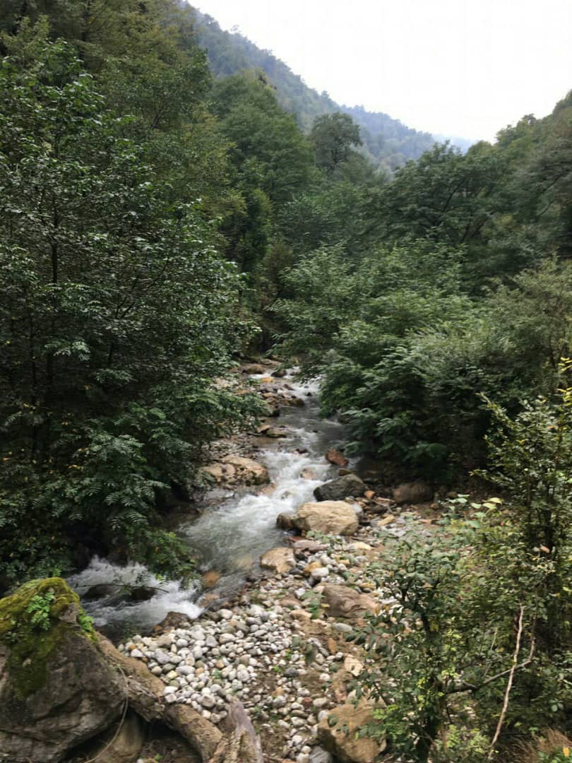 پس از یک توقف کوتاه جهت صرف صبحانه و معرفی عوامل گروه و ارائه توضیحاتی درمورد منطقه، ساعت 9:15 به مسیرمان ادامه دادیم. زمین از برگهای رنگارنگ زرد و نارنجی و قرمز پوشیده شده بود و در بعضی از قسمتها انواع قارچ و گلهای لاله وحشی دیده میشد. مسیر نسبتا هموار و داری پاکوب بوده و بعضی از بخشها صخره ای و کمی شیبدار بود. پس از مدتی پیمایش در جنگل صدای جریان رودخانه بگوش رسید و در نهایت رودخانه ای پر آب مشاهده شد که تا انتهای مسیر ادامه داشت.