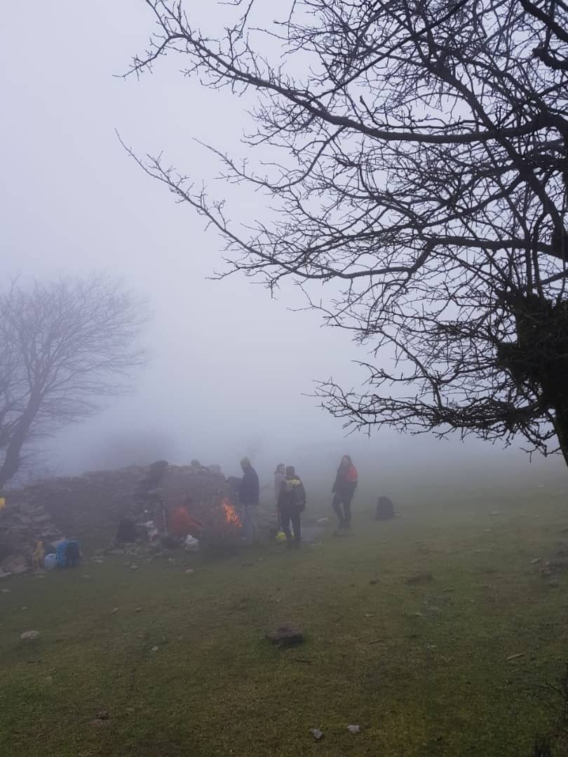 روی زمین هنوز برگهای پاییزی بچشم میخورد و گاها بوته های کوچک گل بنفشه کوهی دیده میشد. بعد از استراحت کوتاهی در ساعت 10:10، ساعت 10:30 به بقایای یک کلبه سنگی رسیدیم که درآنجا تعدادی از همنوردان که قادر به ادامه مسیر نبودند با همراهی یکی از کوهیاران و تعدادی از قدیمی تر های گروه (جمعا 5 نفر) از ما جدا شدند و بقیه اعضا (16 نفر) در ساعت 10:45 مسیر خود را به سمت قله ادامه دادند.