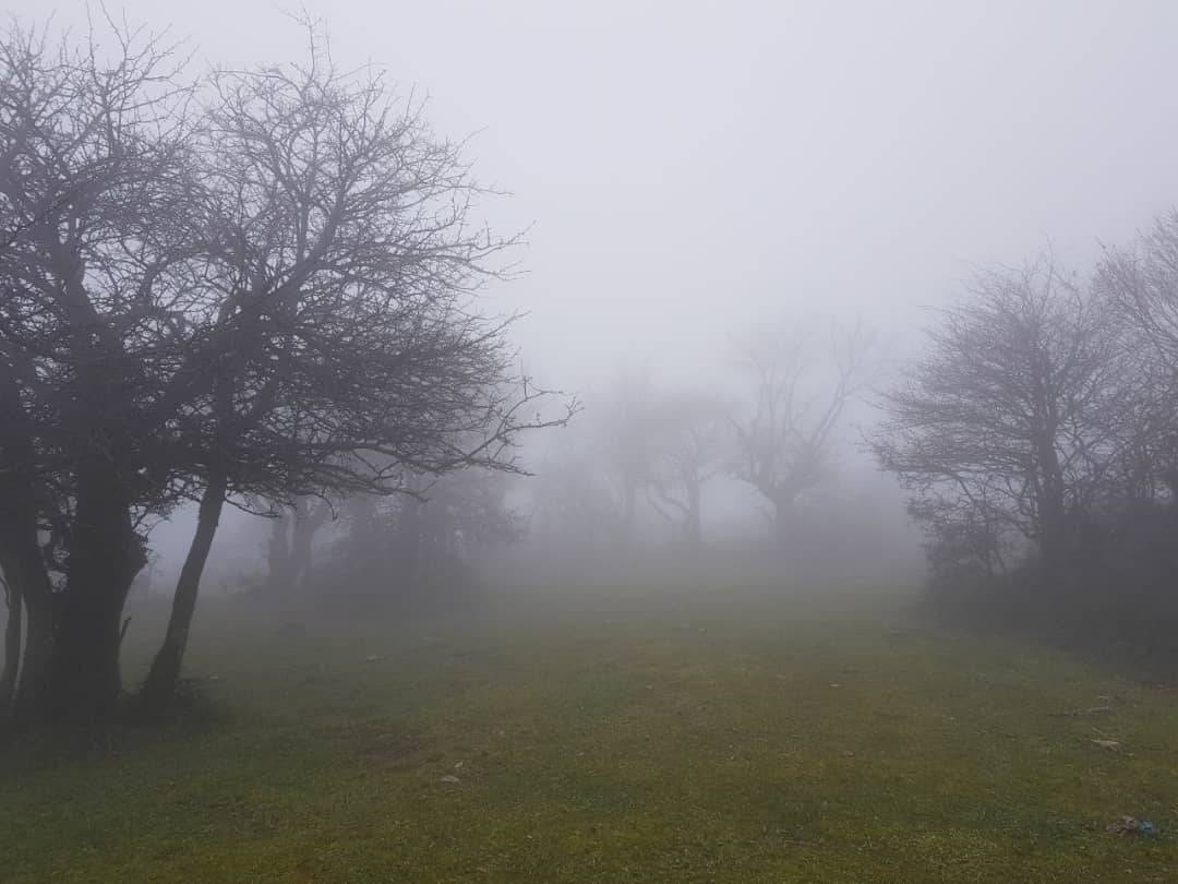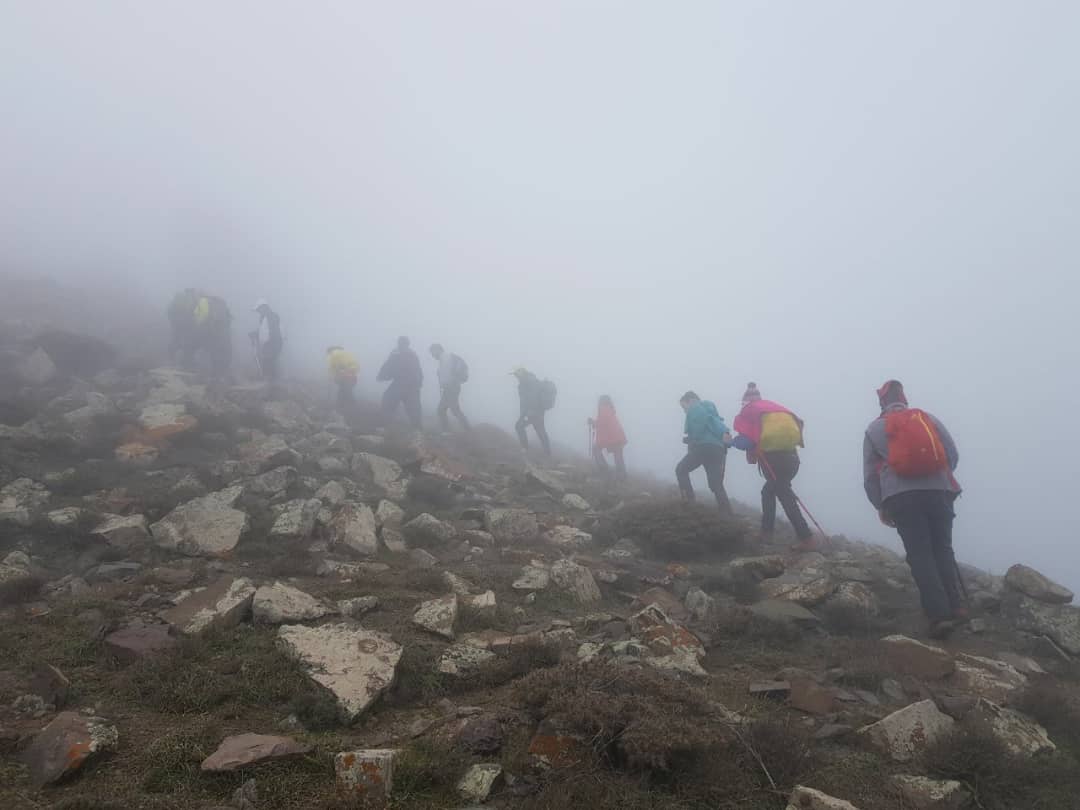 هرچه به قله نزدیکتر میشدیم هوا مه آلودتر و سردتر شده و کم کم از تعداد درختان کاسته میشد و فقط چمن و بوته های کوچک و سنگ ریزه های ریز و درشت به چشم میخورد و حدود یک و نیم ساعت آخر مسیر شیب نسبتا زیادی داشت و برخی از بخشها، خصوصا در نزدیکی های قله کاملا صخره ای بود. نهایتا ساعت 12:10 به قله رسیدیم که دارای یک پناهگاه کوچک ساخته شده از سنگ و چوب و حلب بود که درصورت نامساعد بودن شرایط جوی می تواند مورداستفاده قرار گیرد. پس از توقفی کوتاه و گرفتن عکسهای دسته جمعی، ساعت 12:39 به سمت کلبه برگشتیم. در مسیر بازگشت باد سردی میوزید و مه غلیظی همه جا را دربرگرفته بود و فقط تا چندقدمی قابل دیدن بود و کم کم برف سبکی شروع به باریدن کرد که بعد از چند دقیقه قطع شد. ساعت 14:06 به کلبه برگشتیم و پس از صرف ناهار و استراحتی کوتاه در ساعت 14:34 به سمت پایین حرکت کردیم.