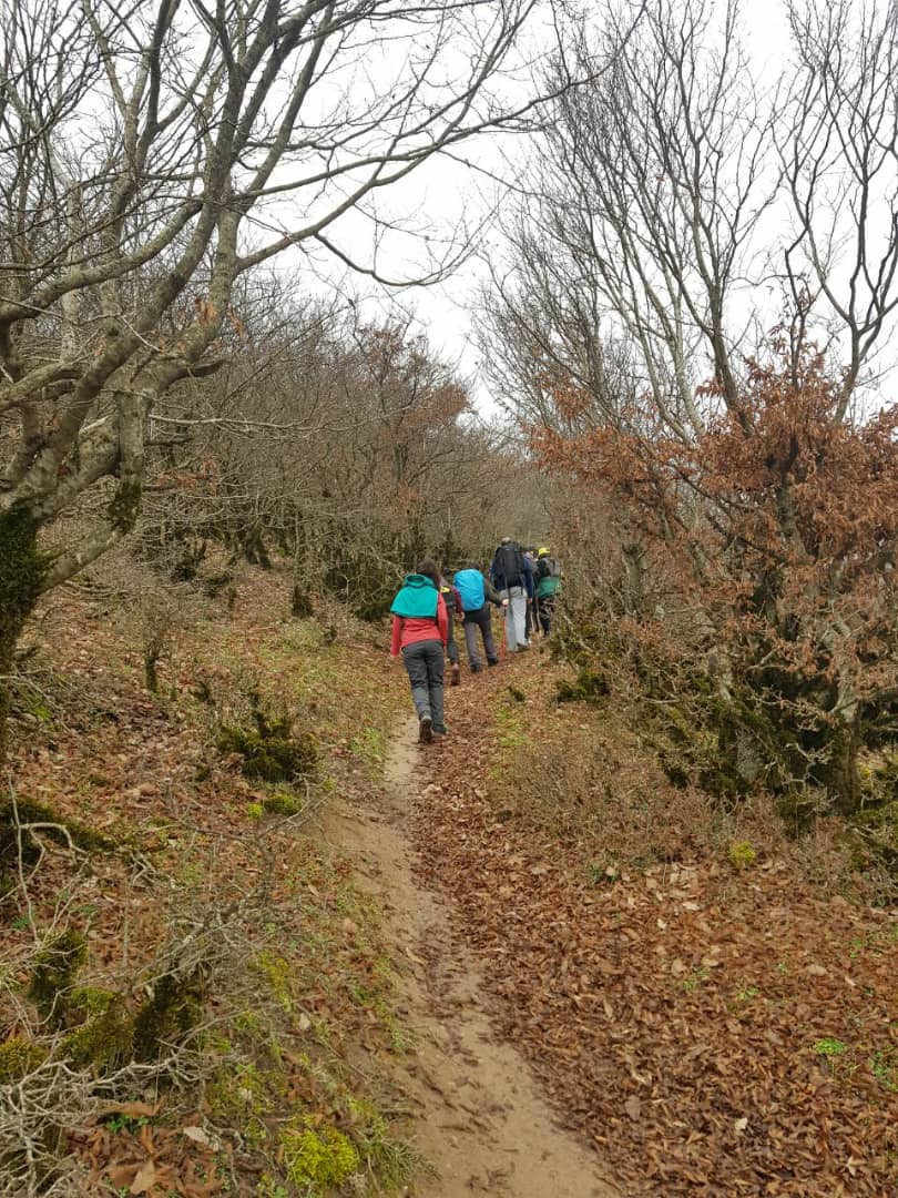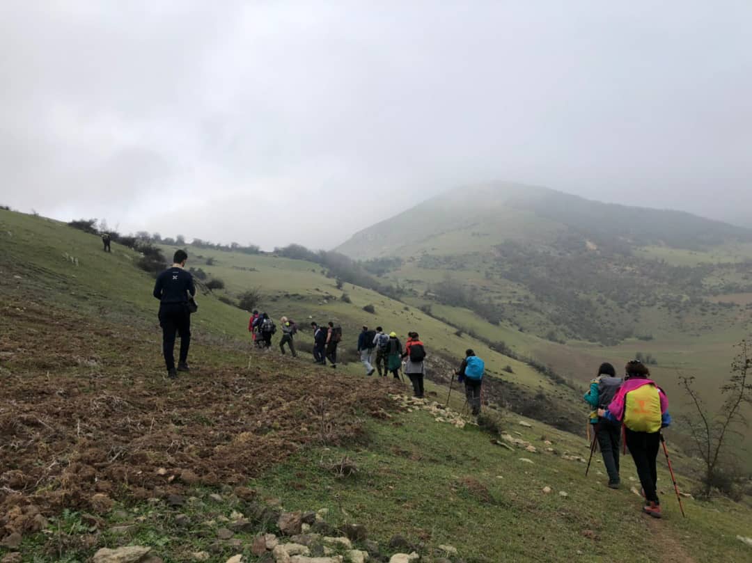 هوا نسبتا سرد و آسمان ابری بود. مسیر جاده ای بوده و از یه طرف توسط کوه و از طرف دیگه توسط درختان احاطه میشد. ساعت 8:55 به چشمه ای که در کنار آن آبشخوری ساخته شده بود رسیدیم و پس از توقفی کوتاه از مسیر شیبداری در سمت چپ آبشخور به مسیر خود ادامه دادیم و پس از رد کردن چند شیب وارد یک مسیر جنگلی پاکوب دار شدیم.