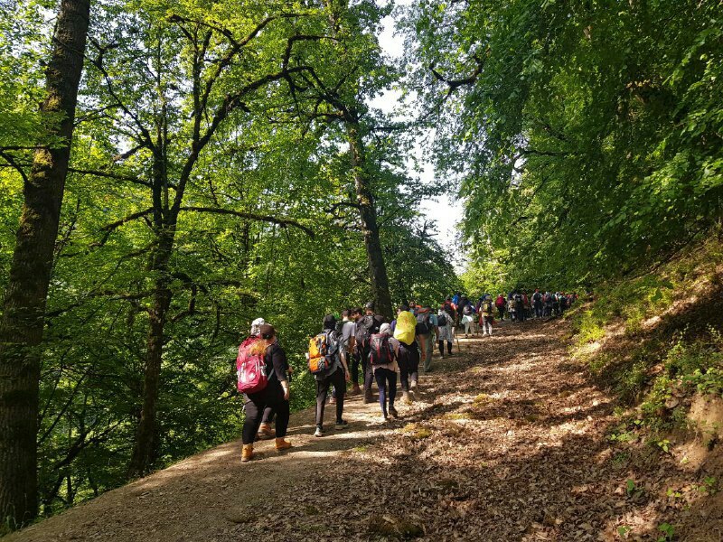 پس از حدود 20 دقیقه پیمایش، جهت صرف صبحانه توقف کردیم و دوباره به مسیر خود ادامه دادیم و در ساعت 8:37 به یک دوراهی رسیدیم که مسیر مستقیم، مسیری جاده ای و مسیر سمت راست، مسیری جنگلی با چالش بیشتر بود که راهنمای برنامه مسیر سمت راست را برای ادامه انتخاب کرد. مسیر با کمی شیب آغاز شد و پس از چند دقیقه وارد جنگل شدیم که گاهی از طرفین با درختان بلند و گاهی با گیاهان بلند احاطه میشدیم. در این برنامه 17 همنورد جدید به جمع گروه اضافه شده بودند که برای اولین بار کوهنوردی را تجربه میکردند، به همین دلیل، جهت رعایت حال دوستان جدید، حرکت گروه به آهستگی و با توقف های زیاد انجام می شد و سرانجام در ساعت 12:15، تقریباً یک ربع مانده به چشمه، در مکانی کنار رودخانه توقف کردیم .