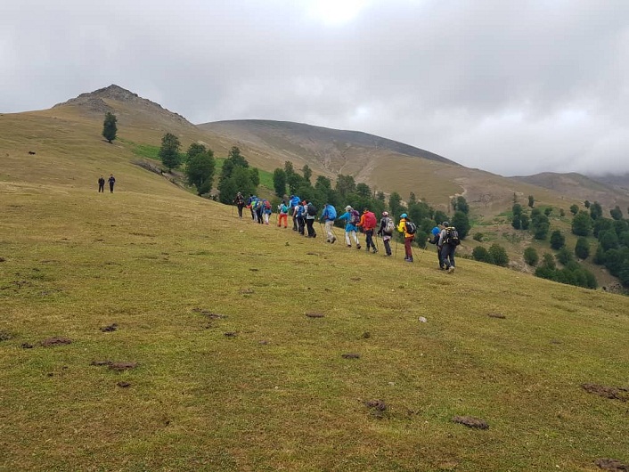 در ساعت 8:30 به راه افتادیم و پس از عبور از شیب جنگلی در ساعت 9:20 به دشت وسیعی به نام سیرک رسیدیم و برای استراحت ده دقیقه ای توقف کردیم. هوا بسیار مطبوع بود. پوشش نود درصدی ابر و در بالا مه نیز داشتیم.