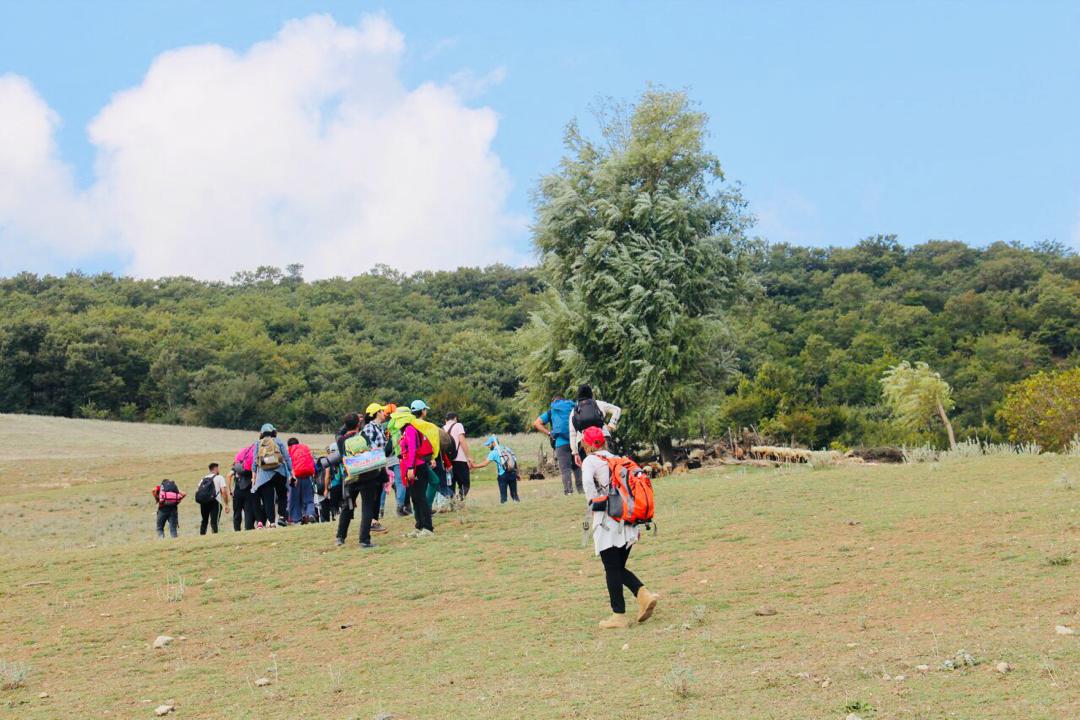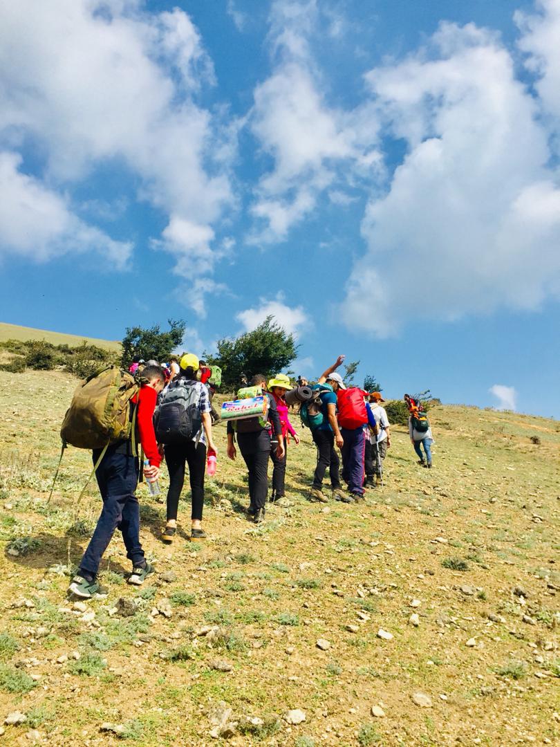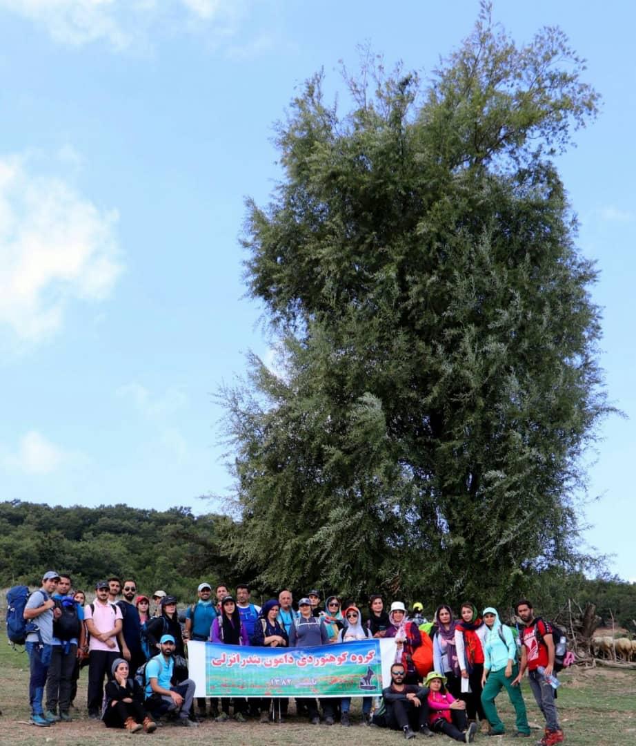 گروه راس ساعت 5:15 صبح جمعه از منطقه چهارطبقه بندرانزلی حرکت خود را آغاز نمود و پس از سوار شدن همنوردان در طول مسیر، ساعت 6:15 از شهرخارج شد و به سمت رستم آباد رودبار حرکت کرد و پس از توقفی کوتاه در مسیر جهت خرید در ساعت 7:40، در نهایت ساعت 8:25 به منطقه مورد نظر در رستم آباد رسید. پس از صحبتهای سرپرست و راهنمای برنامه و معرفی عوامل گروه، ساعت 8:35 حرکت به سمت بالا آغاز شد. ابتدای مسیر یک جاده آسفالته بود که از یک طرف با کوه و از طرف دیگر با گاردریل احاطه شده بود و نمای زیبایی از شهر رستم آباد قابل مشاهده بود. پس از یک پیاده روی جاده ای کوتاه، از سمت چپ وارد یک جاده خاکی با شیب نسبتا قابل ملاحظه ای شدیم. این جاده از کنار چند دکل برق فشار قوی عبور می کرد. در دوطرف جاده تا چشم کار می کرد دشت و بوته های گیاهان بومی دیده می شد و گاهی درختان کوچک انار ترش به چشم می خوردند. در مسیر از کنار چند خانه روستایی مسکونی و تعدادی خانه ویرانه عبور کردیم که به گفته راهنمای برنامه، بقایای زلزله سال 1369 رودبار بودند. در حیاط خانه ها تعداد زیادی بوقلمون و درختان انار دیده می شد.
