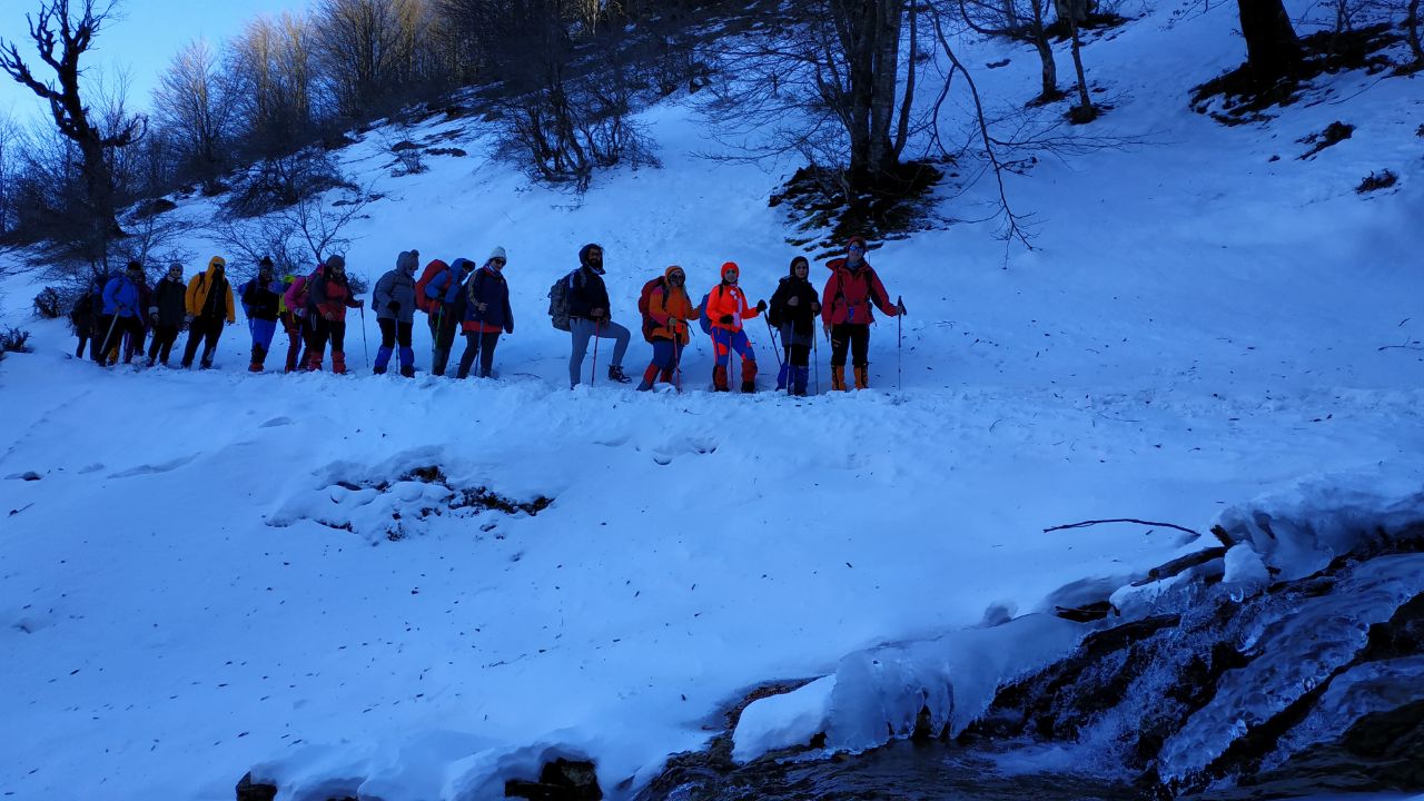 در ساعت ۴:۳۵ دقیقه مینی بوسها با ۳۶ نفر از انزلی خارج شدند و در مسیر توقف طولانی نداشتیم و تنها در ساعت ۵:۱۵ دقیقه در پمپ بنزین توقف کوتاه ده دقیقه ای داشتیم. در نزدیکی ماسوله به دلیل برودت دما جاده ها دچار یخ زدگی شده بودند و این مسئله موجب کند شدن حرکت مینی بوسها شد. در ساعت ۶ و ۴۵ دقیقه به ماسوله رسیدیم. و گروه به سمت بالا حرکت کرد. بعد از گذشتن از پله های یخی در زیر درخت گردویی که در ابتدای مسیر وجود داشت سرپرست برنامه صحبتهای کوتاهی کرد و عوامل اجرایی برنامه را معرفی کرده و در مورد مسیر توضیح کوتاهی داد.
