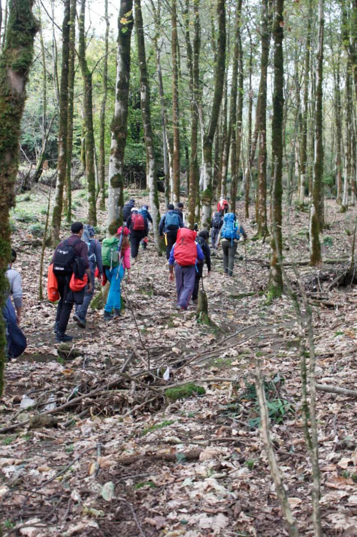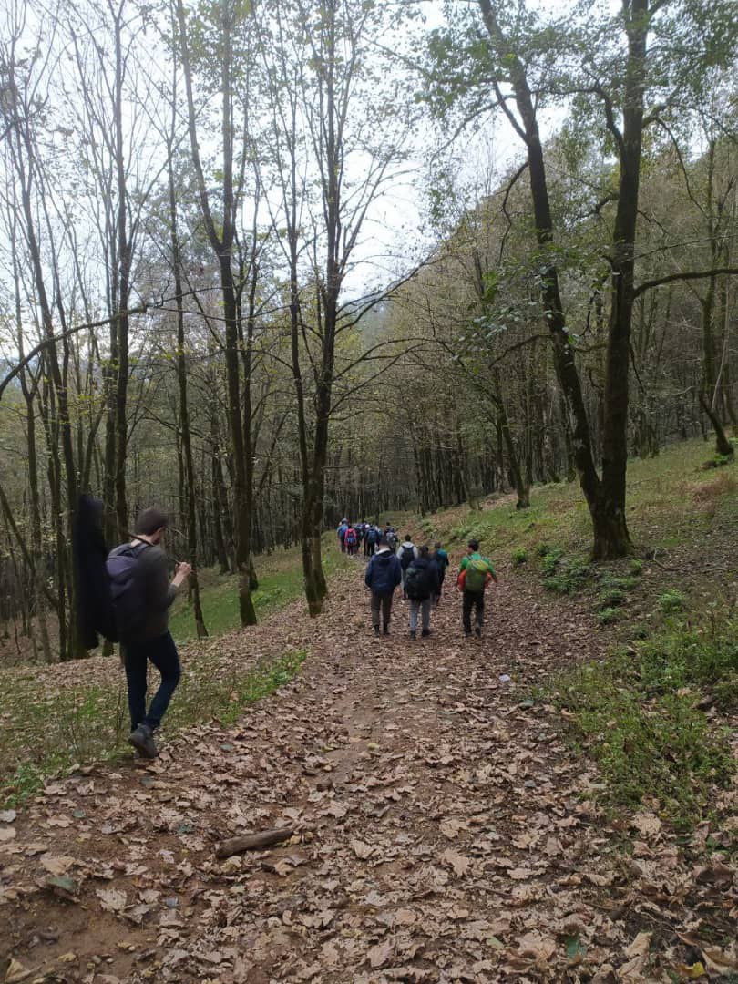 مسیر پر بود از درختان زیبای جنگلی از جمله میوه های وحشی مانند ازگیل جنگلی و گاهی درختان گردو. یک ساعت ابتدای مسیر خاکی و نسبتاً هموار بود و سپس مسیر جنگلی شده و رفته رفته به شیب آن اضافه شد و در حدود دو ساعت، از شیب تندی عبور کردیم که بدلیل گل آلود و لیز بودن زمین، عبور از برخی نقاط کندتر و با کمک کوهیارها صورت می گرفت. آسمان ابری بود و کف جنگل از برگهای رنگارنگ پوشیده شده بود و در برخی قسمتها، دور نمای زیبایی از شهر ماسال دیده می شد.