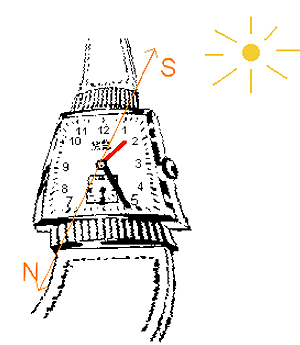 راه دیگر استفاده از ساعت مچی آنالوگ است. با استفاده از زمان میتوانید جهت شمال یا جنوب را پیدا کنید. ساعت را دقیقا روبروی خود نگه دارید. و عقربه ساعت شمار ( عقربه کوچکتر) همانی که با رنگ قرمز در تصویر نشان داده شده است را به طرف خورشید نشانه بگیرید. زاویه بین ساعت ۱۲ و عقربه کوچک را به دو قسمت تقسیم کنید. امتداد این میانه جنوب است. این روش برای زمانی دقیق تر است که در حوالی نیمروز قرار دارید. ولی در کل میتوان به آن استناد کرد!