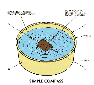 حال اگر آن را روی یک چوب پنبه یا پوشال کوچک قرار دهید (سوزن را به چوبپنبه چسب بزنید، یا درون آن فرو کنید؛ یا در دو طرف سوزن چوبپنبههایی کوچک فرو کنید)، و روی آب (آب راکد یا ظرفی پر از آب) شناور کنید، مانند یک قطبنما عمل میکند، و سر سوزن رو به شمال میچرخد.
