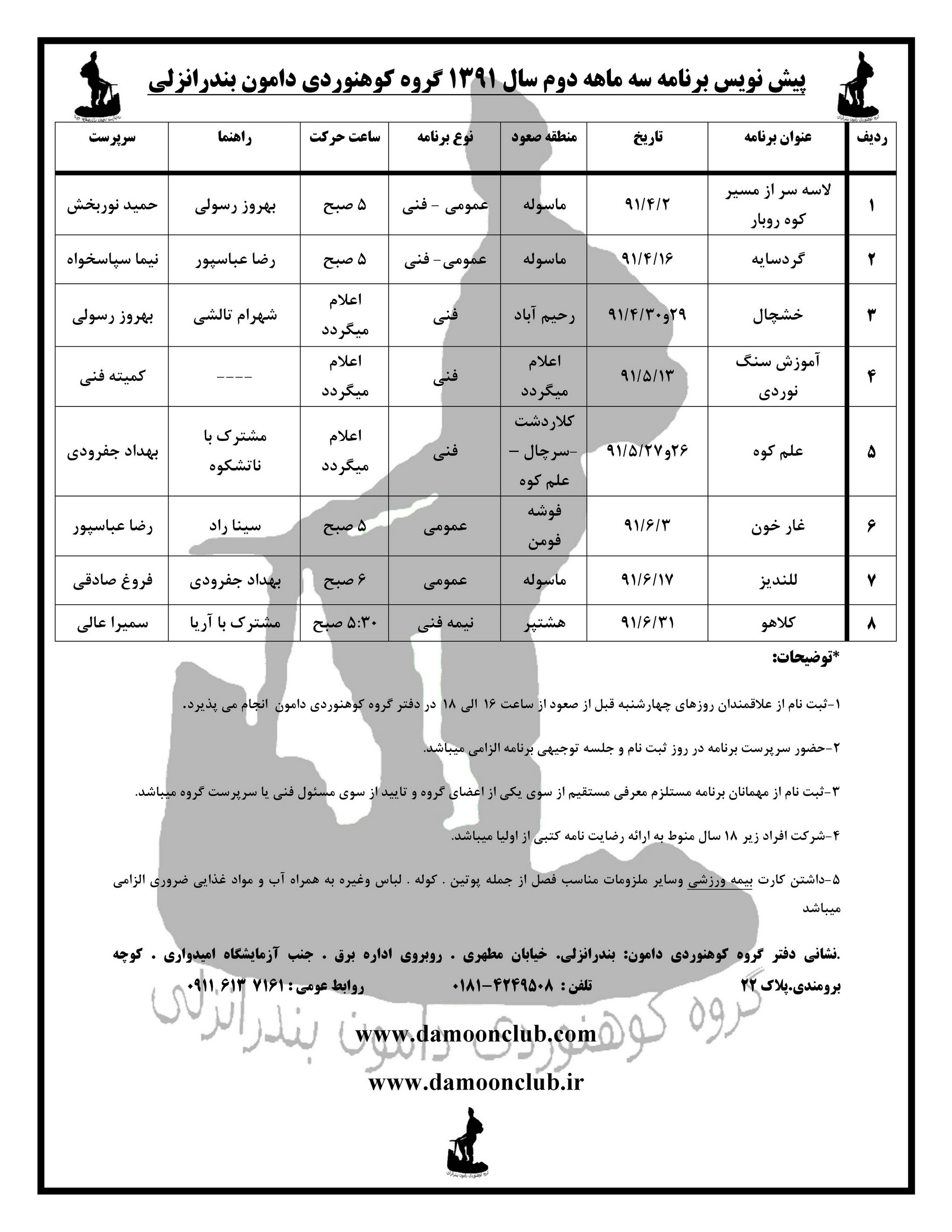 کمیته فنی گروه کوهنوردی دامون امروز جلسه ای را با هدف تعیین پیش نویس نهایی برنامه سه ماهه دوم سال 91 جهت ارائه به هیات مدیره گروه دامون برگزار نمود.این جلسه که دومین جلسه برنامه نویسی کمیته فنی برای تهیه این پیش نویس بود با حضور خانمها فرناز امین سماک و فروغ صادقی و آقایان داود عباسی،بهروز رسولی،نیما سپاسخواه،رضا عباسپور،امیر کامیاب،حامد گنجی،بهداد جفرودی و سینا راد تشکیل گردید و پس از دو ساعت و سی دقیقه بحث و گفتگو برنامه زیر برای ارائه به هیات مدیره پیشنهاد گردید.در این برنامه پیشنهادی علاوه بر در نظر گرفتن اهداف تعیین شده از سوی هیات مدیره با محوریت آموزش،ارتقا سطح فنی اعضای فعلی و امکان جذب نیروهای جدید در گروه،روند منطقی برای برنامه ها به نسبت شرایط امکان حضور اعضا در بیشترین برنامه با توجه به ایام امتحانات و ماه رمضان در نظر گرفته شد.