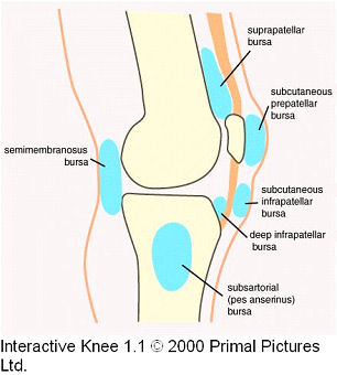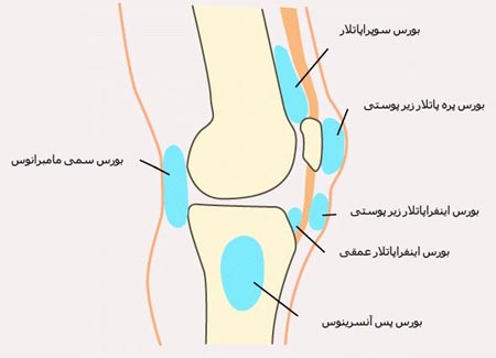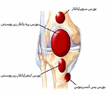 - زانو سه بورس دارد که عبارتند از : بورس کشکک ( جلوی کشکک و زیر پوست ) و بورس زیر کشکک و بورس غازی (Anserine) که در سمت داخل زانو حدود 2 اینچ زیر مفصل زانو قرار دارد.