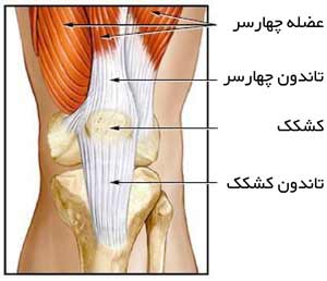 - تاندون عضله چهار سر رانی ( جلوی ران ) در پائین در جلوی مفصل زانو به استخوان کشکک اتصال می یابد و ادامه آن در پائین کشکک به استخوان درشت نی اتصال می یابد. عمل عضله چهار سر رانی باز کردن زانو می باشد.