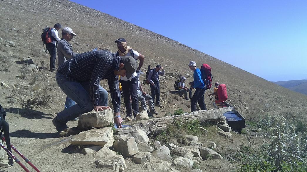 باد ملایم و خنکی می وزید و هوا بسیار مناسب ماندن بود. صبحانه را روی قله خوردیم و پس از استراحت و گرفتن عکس ساعت 8:05 حرکت کردیم. مسیر برگشت ما از مسیر چشمه ها بود که دارای شیب کمتری است تا دوستانی که برای اولین بار به این قله آمده بودند اذیت نشوند. 10:05 به چشمه رسیدیم و حدود یک ربع استراحت کرده به راه افتادیم.