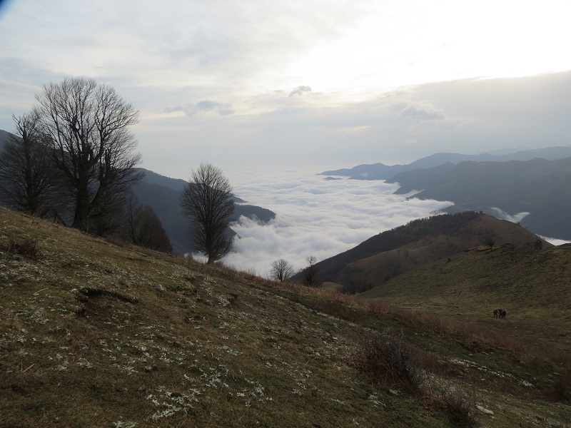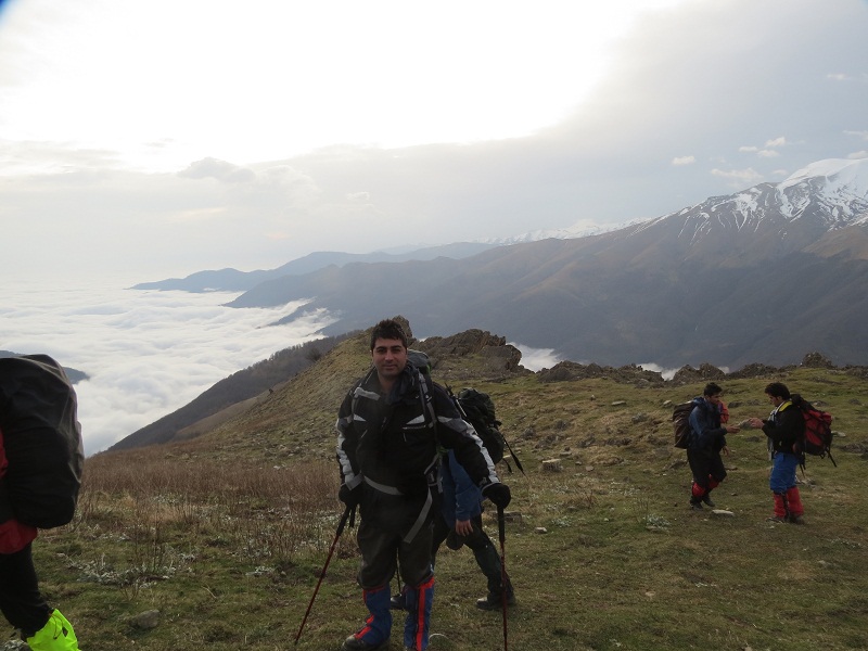 در ادامه مسیر گاهی باد می وزید و در دوردست پشت سر ما ابرهای سفید و پاک انباشته شده بر روی هم دریایی از ابر را بوجود آورده بودند.هنگام بالا کشیدن از دره به علت بد شدن حال یکی از دوستان به گروه ندای رفتن داده و به همراه یکی از همنوردان آن دوستمان را پایین تر آورده تا بتواند ازجایی که جاده دیده می شود به سمت پایین حرکت کند و ما همراه آقای گنجی که به ما رسیده بود شروع به رفتن به سمت بالا کردیم.