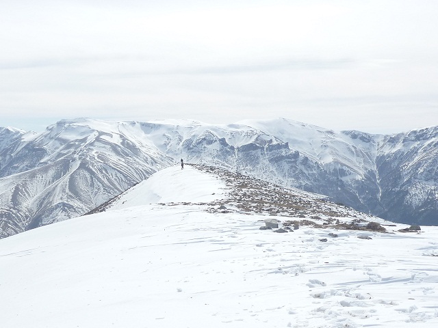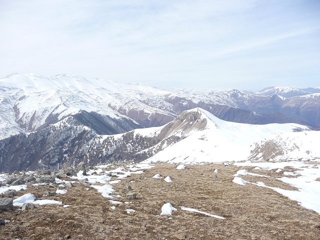 این مکان برای صرف صبحانه بسیار مناسب است. حدود بیست و پنج دقیقه ای توقف کردیم. تعداد کمی در این مکان ماندند و گروه 10:05 به راه افتاد. هوا قدری گرم بود و ما به سمت یال در حرکت بودیم. بر خلاف تصور ما برف چندانی وجود نداشت و فقط یال منتهی به قله دارای برف بود. در ساعت 11:55 به یال اول رسیدیم. قدری استراحت کرده و حرکت کردیم. در ساعت 12:30 به چشمه پای قله رسیدیم. از این جا تا قله حدود 45 دقیقه الی یک ساعت در پیش داشتیم. با تصمیم سرپرست عده ای از دوستان در آنجا ماندند و بقیه در ساعت 12:45 به سمت قله به راه افتادیم. مسیر مقداری گلی و سر بود. در طول مسیر وقتی به پشت سر نگاه می کردیم قله های زیبای پر برف نظاره گر ما بودند. حتما آنها هم از دیدن ما لذت می بردند که با آغوش باز همواره پذیرای ما بودند و هستند. کوله ها و لباس های رنگی بچه های پایین نیز به خوبی دیده می شد. دریای خزر و شهرهای اطراف ماسوله نیز قابل رویت بودند. سرانجام در ساعت 1:45 به قله زیبای تروشوم (دماوند گیلان- نه از نظر بلندی بلکه شکل ظاهری آن) رسیدیم. قله گرد سایه و پشت آن شاه معلم در زیر نور آفتاب پابرجا و استوار همچون همیشه نظاره گر ما بر روی تروشوم بودند.