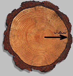 همانطور که می دانید عمر درخت را از روی دایره های تنه درخت حساب می کنند . چون باران ، برف و … از طرف شمال می بارد و از طرف دیگر خورشید از طرف جنوب می تابد . همیشه یک طرف تنه درخت خوب رشد می کند و طرف دیگر رشد خوبی ندارد ، بدین جهت دایره های تنه درخت بصورت منظم و موازی نیستند آنطرف از دایره های تنه درخت که به هم دیگر نزدیکتر می باشد شمال و طرف دیگر جنوب را نشان می دهد .توجه: به درختی نگاه کنید که ریشهاش در زمین باشد، نه به کندهای که بریده شده و بر زمین افتاده!