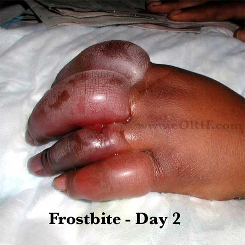 روز نخست : شروع درد ، رنگ پریده شدن پوست ، احساس گزگز و کرختی در عضو یخ زده ، تشدید درد بعد از گرم کردن سریع ، کاهش حس عضو مبتلا