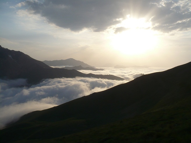 روز اول برنامه است ، ساعت از پانزده عصر در اواخر خرداد گذشته است . سرازیری را بطرف شمال شرقی و در راهی پاکوب ادامه می دهیم و به کاسه دامنه شمالی قله می رسیم با نگاهی به سمت جنوب عظمت قله و دیواره های ستون مانند و یخچال هایش خود را، ستبرتر نشان میدهد. با عبور از چند تکه برفی در مسیر و گذر از چند آبریز و چشمه و علفزار دوباره کاملا در جهت شمال قرار گرفته و در دوردست و پایین راهی پاکوب ما را به خود می خواند ، در بلندیهای شمالی، قله بلور کوه و در سمت چپ و دورتر نمایی از قله بزاکوه دیده می شوند. مدتی در حدود یک و نیم ساعت راه رفته ایم و ناگهان راه کم رنگ و در میان علفها گم می شود ولی همچنان به سمت راست و بالا ادامه می دهیم که باید به چپ و به طرف راهی که از دور دیده بودیم می رفتیم. بلورکوه همچنان در چشم انداز بود و در دره های شمالی جبهه ای از مه لم داده و گاهی از دره ها به طرف بالا دست درازی می کند. به پیمایش مسیر در هوای خوب ادامه می دادیم با اینکه تصمیم گرفتیم تا ساعت حدود30/19 ادامه، تا در جای مناسب، که به آن هم رسیدیم، توقف کرده، شبمانی داشته باشیم، ولی توقف نکرده و خود را به پشت گردنه یک قله فرعی رساندیم. کمی به پشت گردنه سرازیر شدیم. زیراندازها را کنار راهی کم رنگ پهن کردیم. کوله ها را خالی کردیم و غذایی آماده کردیم، با نگاهی به آسمان ابرهای کمی از جنوب به طرف شمال در حرکت بودند هوا رو به تاریکی می رفت ... ازجنوب چند نور برق دیده شد. تصمیم گرفتیم از این محل پایین تر برویم، تا جمع وجور کنیم هوا تاریکتر و ماه به زیر ابر، و مه نیز موفق شده به ما نزدیک شود، برای کم کردن ارتفاع چاره ای جز رفتن به داخل مه نداشتیم. حرکت کردیم و رعد و برق با ما همراه شد چراغ پیشانی را خاموش کردیم آرام در سرازیری در داخل مه و علفزار پیش رفتیم و توانستیم چند سنگ را با ارتفاع در حدود 3-2 متر نزدیک خود ببینیم رعد و برق بیشتر و صدایش بزرگتر شده بود اینجا چاره ای جز توقف نبود. میان چند سنگ و بین دو تای آنها که از هم دومتر فاصله داشتند و سطح زمین شیب دار، زیر انداز را پهن کردیم (در حالی که بر اثر مه زمین کمی خیس بود ) باتون ها را با فاصله یک متر ازخود قرار دادیم کوله ها نزدیک بودند – رعد و برق ادامه داشت و قطره قطره باران پراکنده، برای آنکه کوله ها خیس نشوند آنهارا زیرمان قرار دادیم پس از چند دقیقه تصمیم گرفتیم به علت لوازم فلزی داخل کوله ها آنها را از خود دور کنیم و در حدود سه متری کوله ها را عمودی پای سنگ بزرگ دیگری به همراه باتونها قرار دادیم. نایلون مستطیل شکل نازکی به طول دو متر و با عرض یک متر که داشتیم آماده کرده، در تلاطم ابرها و رعد و برق، تگرک شروع به باریدن کرد کنار هم نشسته و نایلون را بالای سر نگه داشته سعی می کردیم خود را بیشتر جمع و به هم بچسبانیم اما پس از چند دقیقه بارش تگرگ و ضربات ناشی از آن به سر نگران کننده شد ولی قابل تحمل بود تگرگ با رعدوبرق توام شده و برق های آتشین از زیر نایلون دیده می شد ناگهان از قسمت زیر ورود تگرگ به روی زیر انداز باعث خیسی بدن شد، کمی خود را جا بجا کردیم واین بار پشت به پشت هم قرار گرفته و شانه ها را بهم چسبانده دو سر نایلون را روی زانو و دستها را از قسمت آرنج طوری قرار دادیم که ریزش آب وارد آستین نشود پس از حدود ده دقیقه بارش شدید و سپس کمی فروکش کردن در حال نگرانی به فکر جابجا شدن و جای دیگر و حرکت افتادیم به کجا ! بطرف پایین تر، در این شرایط رعدو برق با فاصله و ادامه دارد برای جابجا شدن دوباره بطرف پایین تر باشرایط دید کم... وادامه مسیر! از میان علفزارهای خیس وچشمه، تگرگ زیر پا و مه و خستگی به پایین و سپس به سمت راست دره و در میان دید کم شیبی را بالاتر رفته دوباره چند سنگ دیدیم و تا صبح در محلی که مساحتی کمتر از یک متر داشت و فقط جای نشستن بود توقف کردیم – تا صبح با خیسی و بی خوابی و لرزش صبر کردیم با لباسی که نمدار شده بود. نفوذ سرما در بدن، صدای لرزگاه و بی گاه دوستم ( که بر روی همین زمین کم عرض در کیسه نازک دراز کشیده ب