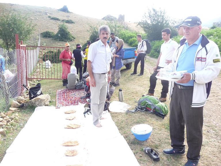 پس از عبور از رودخانه و منطقه حسن دگیرمانی در ساعت 8:10 مسیری در سمت چپ جاده خاکی است که به قله کلاهو می رود. در ساعت 8:40 به منطقه سله یوردی رسیدیم و در جلوی خانه آقای محفوظی پیاده شدیم. ایشان با روی باز پذیرای ما شدند و در فضای باز جلوی منزل زیراندازی انداخته و با شیر گرم-چای-پنیر و کره و نانی که مهندس ملک پور زحمت کشیده و خریده بودند از ما پذیرایی کردند.