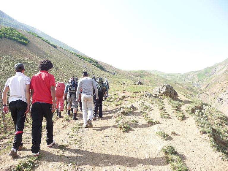 به یک دو راهی رسیده و سمت راست را می رویم. ساعت 6:35 به روستای ریک رسیدیم. در ادامه راه در ساعت 6:42 به منطقه کیشون بن رسیده و ساعت 6:45 از روستای کیش دیبی عبور کردیم. در ساعت 6:52 به یک پل کوچک می رسیم. قبل پل و مسیر سمت راست به ییلاق سوباتان می رود. تابلویی که زده شده احتیاج به باز سازی دارد. از پل عبور کرده و در ساعت 7:19 به منطقه زربیل و حدود یک ربع بعد به منطقه مریان رسیدیم. در این منطقه آثار باستانی و خانه های تاریخی قدیمی وجود دارد. حمام سردار امجد که یک بنای تاریخی با سنگهای آجری می باشد در سمت راست در چمنزار قابل رویت بود. این منطقه دارای ییلاقی به نام آق اولر می باشد. در ساعت 7:50 به دو راهی می رسیم و سمت راست را داخل می شویم. ساعت 7:55 است که مسیر پیش روی ما دارای آبگیر کوچکی است و به علت آب مینی بوس همان جا توقف کرده و پیاده می شویم. ارتفاع 1200 متر می باشد. آقای ملک پور با نیسان وانت دنبال ما آمدند و همگی سوار نیسان شده و به سمت منطقه حسن دگیرمانی راه افتادیم.