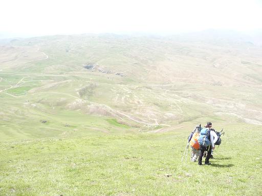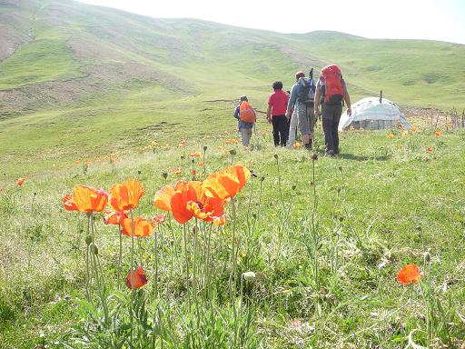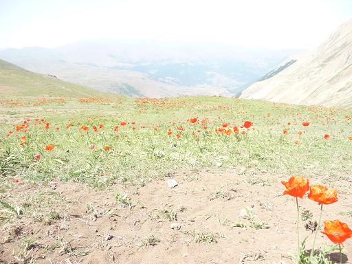 به راه ادامه می دهیم. منطقه فوق العاده زیباست و شقایق های درشت قرمز زیبایی آن را افزون کرده بود. درختی در مسیر نیست و با دشت های وسیع در اطراف خود مواجه هستیم. در پایین دره سمت راست ما (دشتی که در پایین دست ما در مکان دره مانند با پوشش چمنزار قرار دارد) عشایر منطقه عروسی داشتند و صدای ساز و آواز بطور واضح شنیده می شد و ما از بالا جمعیتشان را می دیدیم که در حال تکاپو هستند.