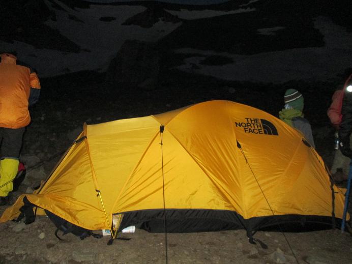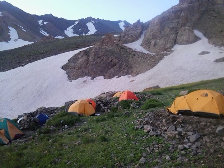 این منطقه دارای چشمه است و مکان مناسبی برای چادر زدن در صعودهای دو روزه از مسیر شمالی محسوب میشود... بعد از چند دقیقه استراحت اقدام به برپایی چادرها می کنیم... تعداد چادرهایمان 14 عدد بود و پس از برپایی انها در این منطقه برای هم هوایی نیم ساعتی قدم میزنیم و بعد به شام خوردن میپردازیم و بعد آن ساعت 12:00 شب در بیرون چادر به کوله چینی مشغول بودیم که بر روی یال برفی کوه مقابلمان با دو نور چراقی به صورت چشمک زن که ما را به خودش جلب توجه کرده بود متوجه کمک خواستن دو کوهنورد شدیم که مسیر را گم کرده بودند. این کوه دارای یخچال با شیب تند بود. یک لحظه به ذهنم رسید که در کوله خودم لیزری دارم و این میتونست بهترین وسیله برای نشان دادن مسیر به ان دو کوهنورد باشه که سریعا با لیزر به کمک دوستان مسیر درست رو به صورت زیگزاگی برای شکستن شیب یخچال به این دو کوهنورد نشان دادیم و از اینکه به سلامت فرود اومدن خیلی خوشحال بودیم و با چایی گرم ازشون پذیرایی کردیم و ساعت 2:00 خوابیدیم ...