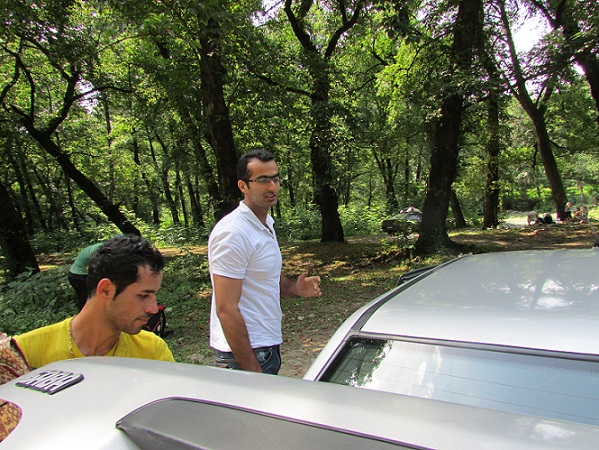 تقریبا 6 کیلومتراز مسیر جاده ابشار گذرونده بودیم که 3 نفر از دوستان گروه که با ماشین شخصی امده بودند به جمع ما پیوستند.در هنگام استراحت کوتاهی همه ی تجهیزات و کوله پشتی رو در داخل ماشین دوست عزیزمون جا دادیم تا از شیب های تند این جاده راحت تر بگذریم و تا ابشار دوستان ما رو همراهی کردند تا اینکه ساعت 12:30 به ابشار رسیدیم که همزمان 2 نفر از اعضای دیگر گروه که با ماشین شخصی تشریف اورده بودند و وجودشان باعث دلگرمی دوستان بود به ما ملحق شدند.